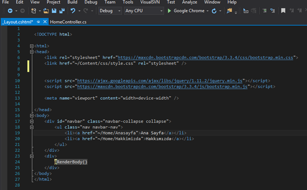 Layout dosyamızın içerisinde Css ve Script dosyalarına veya sitemizin diğer sayfalarına linkler verip sayfalara ulaşım sağlamaktayız. Bu linkler standart olarak Html formatı kullanılarak yaptığımız linklerdir. Url Helpers sayesinde Razor olarak MVC platformunun özelliklerini kullanalım.