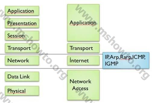 Öncelikle OSI referans modeli ve TCP/IP katmanlarını şekle bakarak hatırlayalım. Şekilde de görüldüğü gibi OSI referans modelinde Network olarak isimlendirilen katmanTCP/IP modelinde Internet katmanı olarak adlandırılıyor.