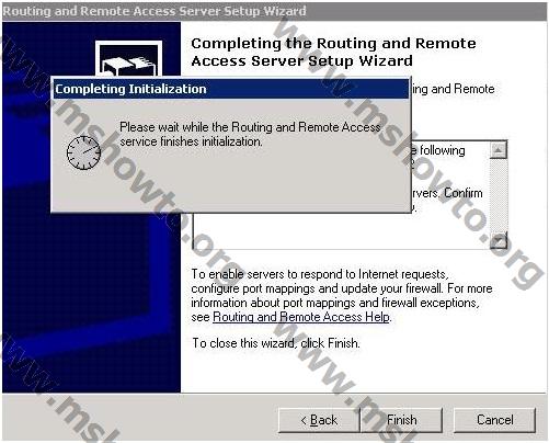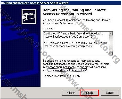5.)    Aşağıdaki resimden de görüldüğü gibi işlemimiz başarılı bir şekilde sonlanmış durumda, RRAS yönetim aracına geçebilmek için “Finish” diyerek bu bölümden çıkıyoruz.
