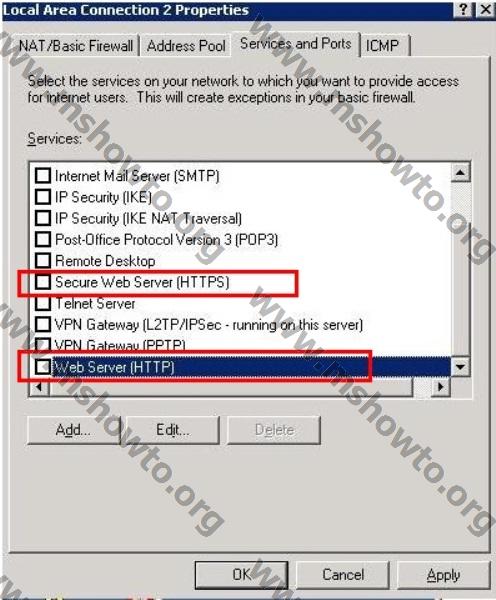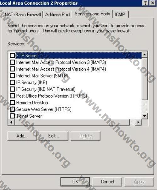 7.)    Network bağlantısının özelliklerinde “ Services  and  Ports” sekmesine geliyoruz . Default olarak  karşımıza aşağıdaki  işlem seçenekleri geliyor . İsterseniz bu bölüme “Add”  tuşu ile farklı servislerin portlarını açarak NAT üzerinden hizmet verebilirsiniz.