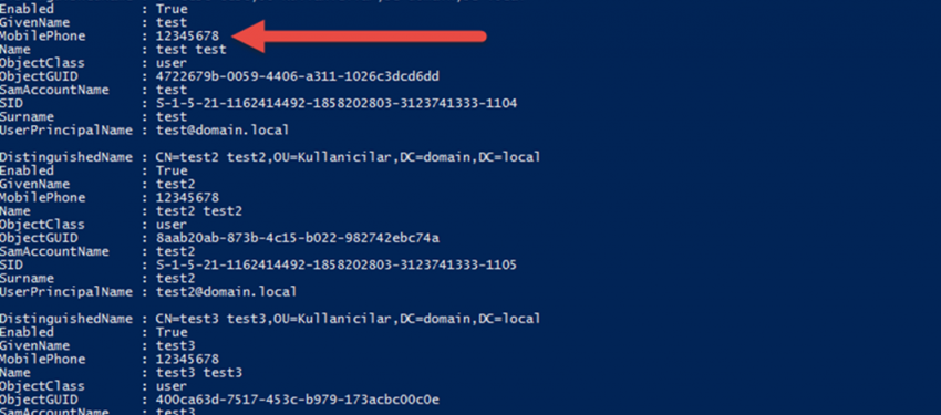 Şimdi kullanıcı bilgilerini çekerken cep telefon numaralarını da gelen değerlere ekleyelim. Bunun için “Get-ADUser” komutunun “-Properties” parametresine değer veriyoruz. “MobilePhone” parametresinde bu değer mevcut. Tabi örnekteki telefon numaraları test sistemi olduğu için yanlış ???? (Resim-4)