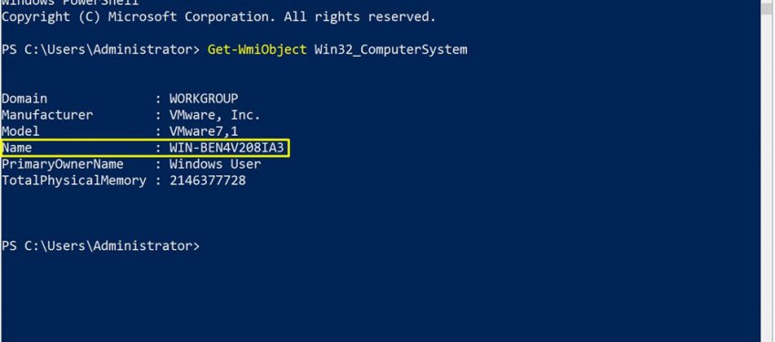 1- Get-WmiObject Win32_ComputerSystem komutu ile öncelikle, Server makinamın Hostname’ini kontrol ediyorum.