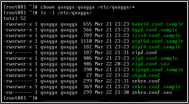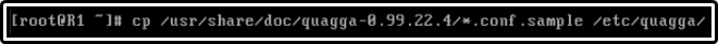 Konfigrasyon dosyaları “/etc/quagga” klasöründedir. Örnek dosyaları “/usr/share/doc/quagga/” klasöründen kopyalıyoruz.