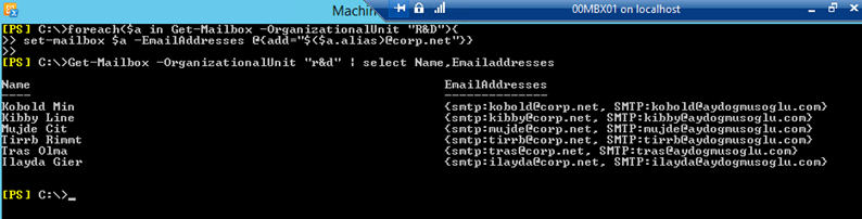 Üstteki döngü ve içindeki cmdlet ile R&D Organizational Unit’i içindeki Mailbox’lara @corp.net suffix‘ini e-mail adresi olarak yapılandırdım. Get- ile bakıldığında sonuç görünüyor.