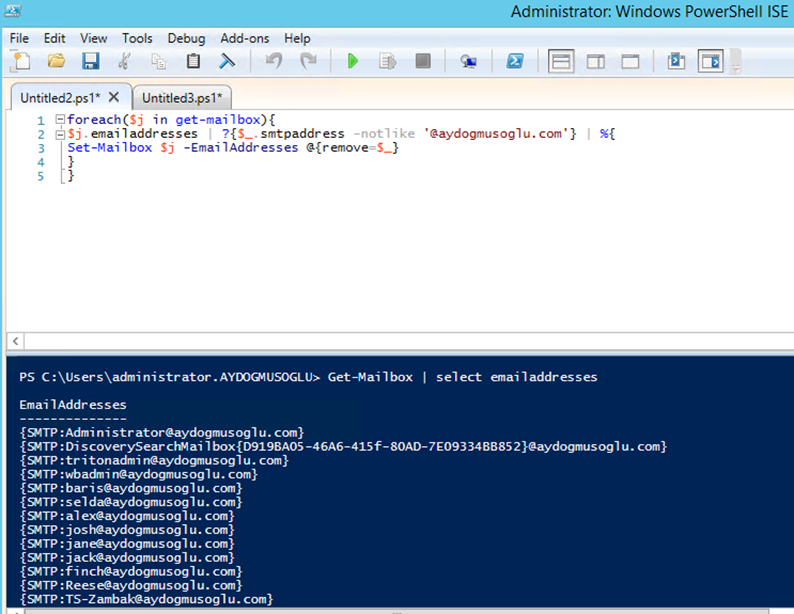 İşlem tamamlandı. Son durumda Mailbox‘ların Email adresleri üstteki gibidir. Bulk işlemlerde ve günlük Operasyonel işlemlerde base teşkil edebilecek bu döngü ile ve cmdlet’ler ile gereksinimlerinize göre kişiselleştirilmiş ve daha gelişmiş Script’ler hazırlayabilirsiniz.