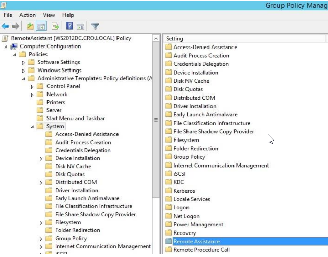 Oluşturduğum policy’i yapılandırmak için ; Computer Configuration – Policies – Administrative Template – System – Remote Assistance kısmına gelinir.