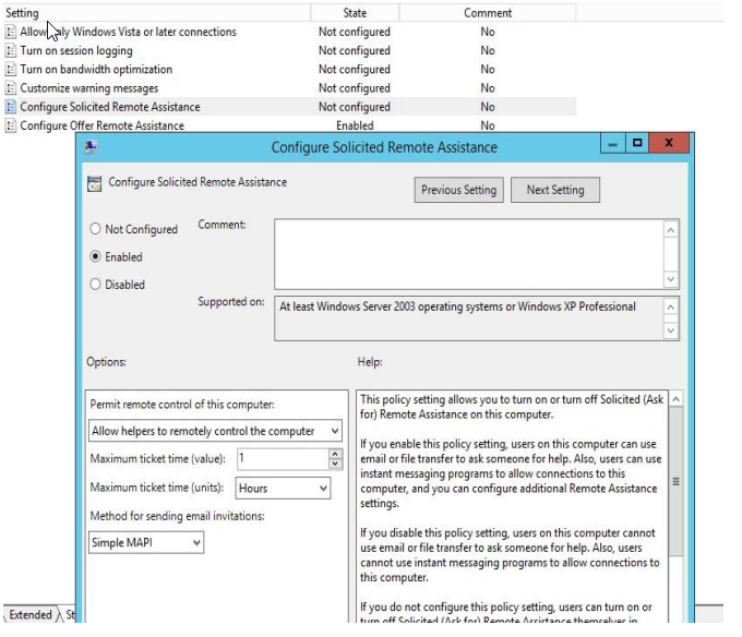 Oluşturduğum policy içerisinde diğer yapılandıracağımız kısım yine Computer Configuration – Policies – Administrative Template – System – Remote Assistance altında Configure Solicited Remote Assistance kısmıdır. Default olarak yapılandırılmamıştır. Policy’i aktif ettikten sonra kullanabileceğimiz 4 seçenek karşımıza çıkmaktadır. Yeniden control seçeneği ile bağlantı atacağımız bilgisayarın kontrol edebileceğiz , Ticket Time kısmı 1 hours olarak default gelmektedir. Atılan bağlantının max süresi belirlenmiş olur. Method for sending email invitiations kısmında Simple MAPI seçeneği anlık mesajlaşma hizmetini vermektedir. Diğer seçenek ise mail to seçeneğidir. Mail to anlık bağlantı ve iletişimde efektif olmayacağı için Simple MAPI olarak yapılandırmak daha doğru olacaktır.