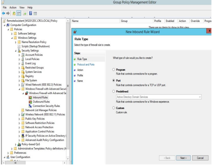 Computer Configüration – Policies – Windows Settings – Security Settings – Windows Firewall – Inbound Rules kısmına gelinir . New rule diyerek yeni kural eklenmektedir.