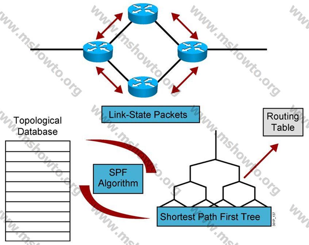 Router’lar gelen LSA’ları link state database’inde biriktirir. Biriktirdikleri bu LSA’lar ile her router kendisini en tepeye koyarak bir ağaç yapısı oluşturur. Bu sayede topoloji tablosunu dallandırarak genişletir. Daha sonra bu topoloji tablosu üzerinde çalıştırdığı SPF(shortest path first) algoritması ile hedef network’lere giden en kısa yollar belirlenir ve bu yollar routing tablosuna işlenir.