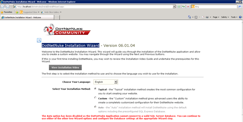 DotNetNuke web sayfanız açıldıktan sonra, DotNetNuke kurulum sayfası karşınıza gelecektir.