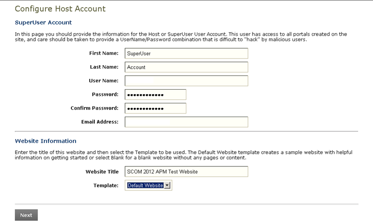 Next butonu ile devam ettikten sonra Configura Host Account ekranı karşınıza gelecektir.Burada yapmanız gereken website’ınıza erişebilmek için bir SuperUser hesabı tanımlamaktır.