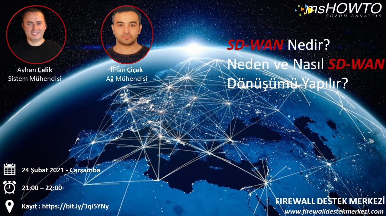 Mshowto Topluluğu ve Firewall Destek Merkezi olarak 24 Şubat 2021 Çarşamba saat 21:00′de son yılların network alanındaki en büyük dönüşümlerinden birisi olan SD-WAN teknolojilerine üzerine yapacağımız webcast‘e sizleri davet ediyoruz.
