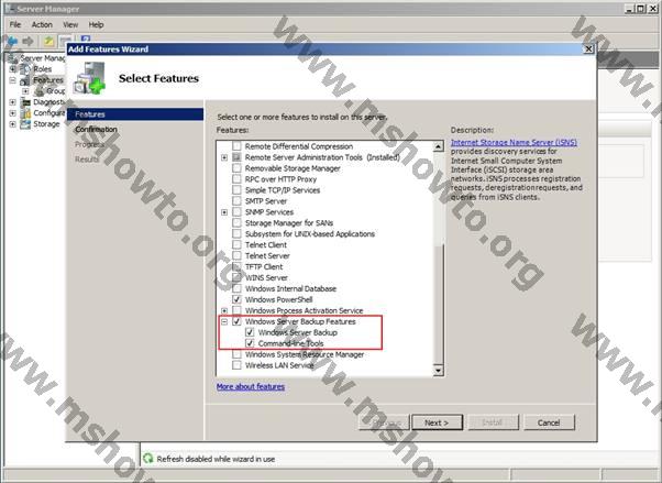1. Windows Server Backup bir özellik (feature) olarak geliştirilmiştir. Bu yüzden kurulum için “Start/Administrative Tools/Server Manager” penceresinde “Features” bölümünü kullanacağız. Buradaki “Add Features” bağlantısına tıkladıktan sonra açılan listeden “Windows Server Backup Features” seçeneğini işaretleyin (Şekil 1).
