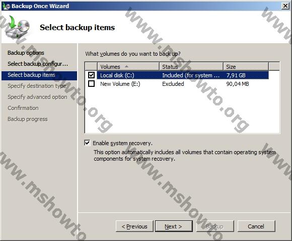 7. Bu aşamada yedeği alınacak sürücüleri seçiyoruz (Şekil 4). Herhangi bir felaket anında sunucunun işletim sistemini yeniden kurabilmek için “Enable system recovery” seçeneğini işaretlemelisiniz. Böylece işletim sisteminin yeniden kurulabilmesi için- yedeği alınması gereken sürücüler otomatik olarak seçilecektir. Eğer isterseniz sürücü seçimini kendiniz de yapabilirsiniz.