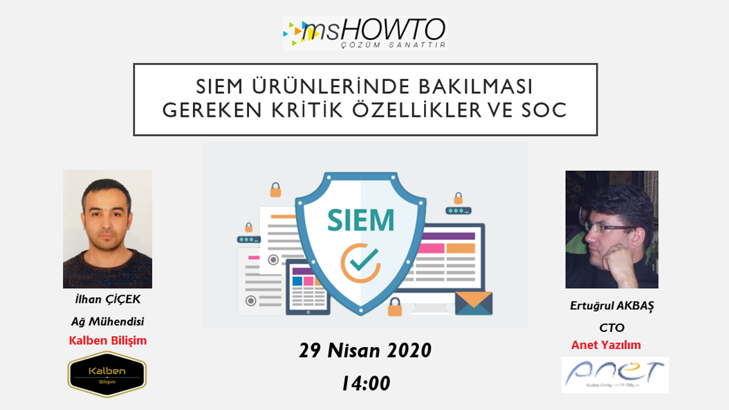 Mshowto Topluluğu olarak sizlere her hafta farklı konu ve konuşmacıların olduğu webcast’ler planlıyoruz. Bunlardan bir yenisini de 29 Nisan 2020 Çarşamba günü saat 14:00’da gerçekleştiriyoruz. Konuşmacılar ise yazarlarımızdan ve Kalben Bilişim Ağ Mühendisi İlhan Çiçek ve SIEM çözümleri konusunda çok tecrübeli ve konu uzmanı bir kişi olan Anet Yazılım CTO’su Ertuğrul Akbaş sizlere “SIEM Ürünlerinde Bakılması Gereken Kritik Özellikler ve SOC” konusunu anlatacaklar.