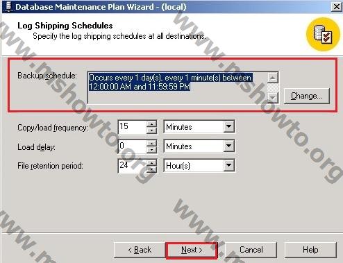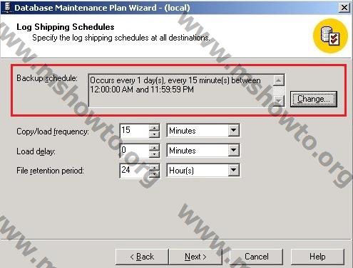 Log Shipping Schedules ekranında bu görevin hangi zamanlarda çalışmasını istiyorsanız tanımlamak için Change diyoruz,