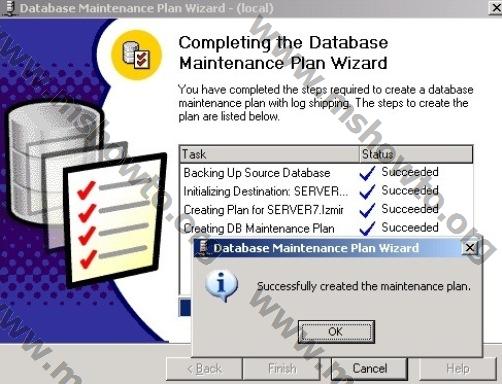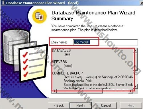 Buraya kadar herhangi bir problem ile karşılaşmadık. Database Maintenance Plan Wizard Summary ekranında bu aşamaya kadar yapmış olduğumuz yapılandırma işleminin özetini görebilme olanağına sahibiz, eğer burada yer alan bilgiler doğruysa işlemimizi tamamlamak için Next diyoruz.