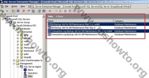 Şimdi ise buraya kadar yapmış olduğumuz işlemleri kontrol edelim. İlk olarak Sql Server Manager yönetim konsolunda Management altında hizmet veren Jobs bölümünü kontrol ediyoruz. Şekilde görüldüğü gibi birinci (ana) Sql Server ‘da backup ile ilgili job’ların oluştuğunu görüyoruz.