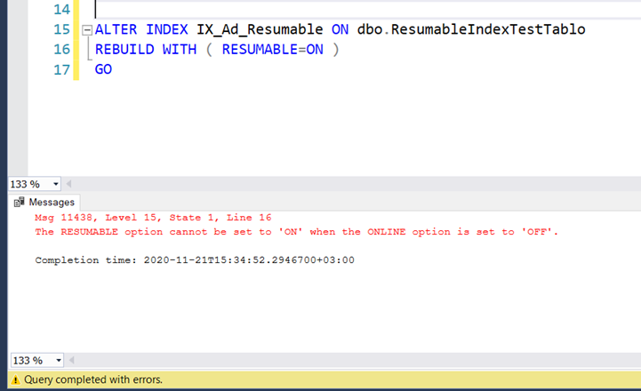 Aşağıdaki gibi yeni bir Non-Clustered index ekleyelim. Index scriptimde RESUMABLE=ON olarak oluşturulmasını istiyorum. Fakat görüldüğü gibi bu işlemi tek başına kullanmama izin vermeyip hata mesajında benden ONLINE=ON yani hem Online hem de Resumable seçeneklerinin açık olarak oluşturulmasının mümkün olduğunu belirtmektedir.