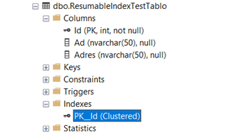 ALTER INDEX IX_Ad_Resumable ON dbo.ResumableIndexTestTablo REBUILD WITH ( RESUMABLE=ON , ONLINE=ON , MAX_DURATION=120 MINUTES) GO ALTER INDEX IX_Ad_Resumable ON dbo.ResumableIndexTestTablo RESUME WITH ( MAX_DURATION=60 MINUTES )