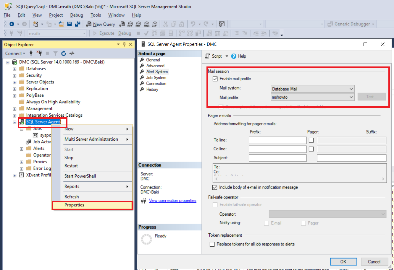 Operator tanımladıktan sonra Sql Server Agent’a Properties penceresini açarak Alert System üzerinden mail profile’ı aktif ediyoruz.