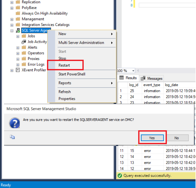 Yaptığımız değişikliklerin aktif olabilmesi için Sql Server Agent’a sağ tıklayıp Restart ederek yeniden başlatıyoruz.