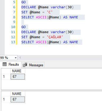 select CHARINDEX(‘@’, ‘caglarozenc@gmail.com’) As CHARINDEX