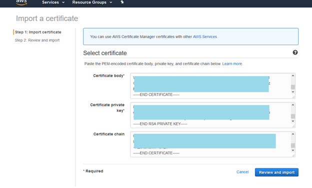 Sonuçta Resim-11 deki şekilde sertifika import ekranını doldurmuş olduk. Review and Import butonuna basarak yüklediğimiz sertifikanın kontrolünü sağlatıyoruz.