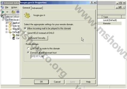 Dışarıdan gelen maillerin brightmail üzerinden geçtikten sonra bir şekilde mail serverimize yönlendirilmesi gerekiyor. Bunun için IIS üzerinde Default SMTP Virtual Server de yeni bir SMTP domain yaratmamız gerekiyor. Oluşturduğumuz yeni SMTP domain üzerinde “allow incoming mail to be relayed to this domain” seçeneğinide işaretleyerek izin verilecek ve forward edilecek mail serverimizin ip numarasını [ ] aralığında giriyoruz. Böylece gelen postalar belirlediğimiz ip numarasına geçecek ve mail alışverişimiz sağlıklı bir şekilde devam edicek (bu durumun dışında firewall ve mail server üzerinde SMTP connectorun yapılandırıldığını varsayıyorum)