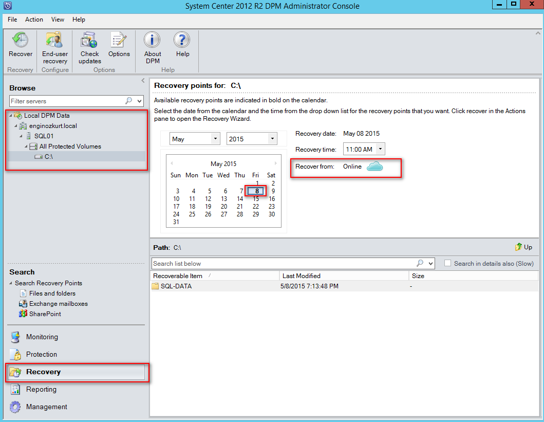 DPM Administrator konsolu üzerinde Recovery > Local DPM Data > SQL01 > C:\ tıklıyoruz. Recovery points ekranında en son aldığımız datanın zamanı ve “Recovery time” ve “Recovery from” : Online (Yani Azure üzerinden Recovery edeceğiz.)