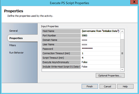 Buradaki önemli nokta “PS Script 01” yazan kısma Powershell scriptimizi kopyaladıktan sonra gerekli isterlerin girilmesidir. Öncelikli olarak ilgili makinelere Orchestrator ürünün bulunduğu makinenin 5985 portu üzerinden erişimi olması gerekmektedir. Aksi takdirde Powershell scripti çalışmayacaktır. Ayrıca scripti çalıştıracağımız kullanıcı ve domain bilgileri de girilmek zorundadır.