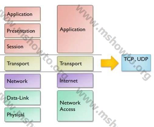 Yukarıdaki şekilde de görüldüğü gibi OSI modelindeki ilk 3 katman TCP/IP modelinde birleştirilerek Application katmanı altında toplanmıştır. Transport katmanı aynı kalırken, Network katmanı ismini Internet katmanı olarak değiştirmiş, Datalink katmanı ve Physical katman ise Network Access olarak bir araya getirilmiştir.