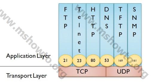Şekilde görüldüğü gibi Application katmanındaki protokoller de işleyişleri bakımından TCP yada UDP olarak ayrılmaktadırlar. TCP yada UDP olan paketin uygulama katmanında çalışan hangi protokole ait olduğunu ise üzerlerinde bulunan port numaraları belirler. Bu port numaraları sayesinde Application katmanındaki protokoller ayırt edilirler. Örneğin FTP protokolü TCP çalışan bir protokoldür. FTP iletişimden önce taraflar arasında TCP session oluşturulur ve sonrasında iletişime başlanır. Bu iletişimde transport katmanına gelen paket Application katmanında FTP protokolüne yönlendirilmek için 21 numaralı porttan Application katmanına gönderilmelidir. Bu gibi Application katmanında çalışan protokollerin kendilerine özgü port numaraları vardır. Well Known Port Number olarak isimlendirilen bu port numaraları sayesinde standartlaştırılmış bir iletişim söz konusu olur. 1024’e kadar olan port numaraları Well Known Port Number olarak bilinmektedir. Bazı uygulama katmanı protokolleride farklı işleyişlerde farklı transport katmanı protokollerini kullanabilirler. Bunlara örnek olarak DNS verilebilir. DNS’ yapılan sorgular da UDP protokolü kullanılırkeni DNS server’ların kendileri arasında yaptıkları replikasyonlarda TCP protokolü kullanılmaktadır.