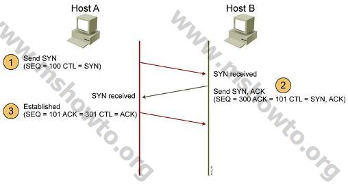 1- Şekile baktığımızda Host A isimli cihaz Host B isimli cihaz ile iletişime geçmek istediğinde ilk yollayacağı paket SYN (Synchronize) paketidir. Bu bir hostun başka bir hostla iletişim kuracağı zaman yollayacağı ilk pakettir. Bu paketi yollarken pakete bir sıra numarası eklenir. Bu sıra numarasına Sequence Number denir. Random olarak bir numara seçilerek iletişime başlanır. Şekilde görüşdüğü gibi ilk paketin Sequence numarası 100’dür. CTL=SYN ifadesi ise paketin Synchronize paketi olduğunu gösterir. Bu paketin SYN olması içinde header’daki TCP paket tiplerinden SYN kısmının değeri 1 olarak değiştirilir.