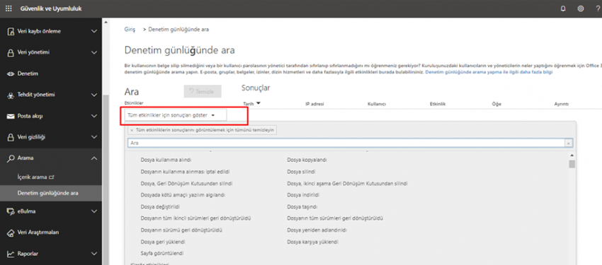 Office 365 paneline giriş yaptıktan sonra; Yönetici > Yönetim Merkezi > Güvenlik ve Uyumluluk > Arama > Denetim günlüğünde ara