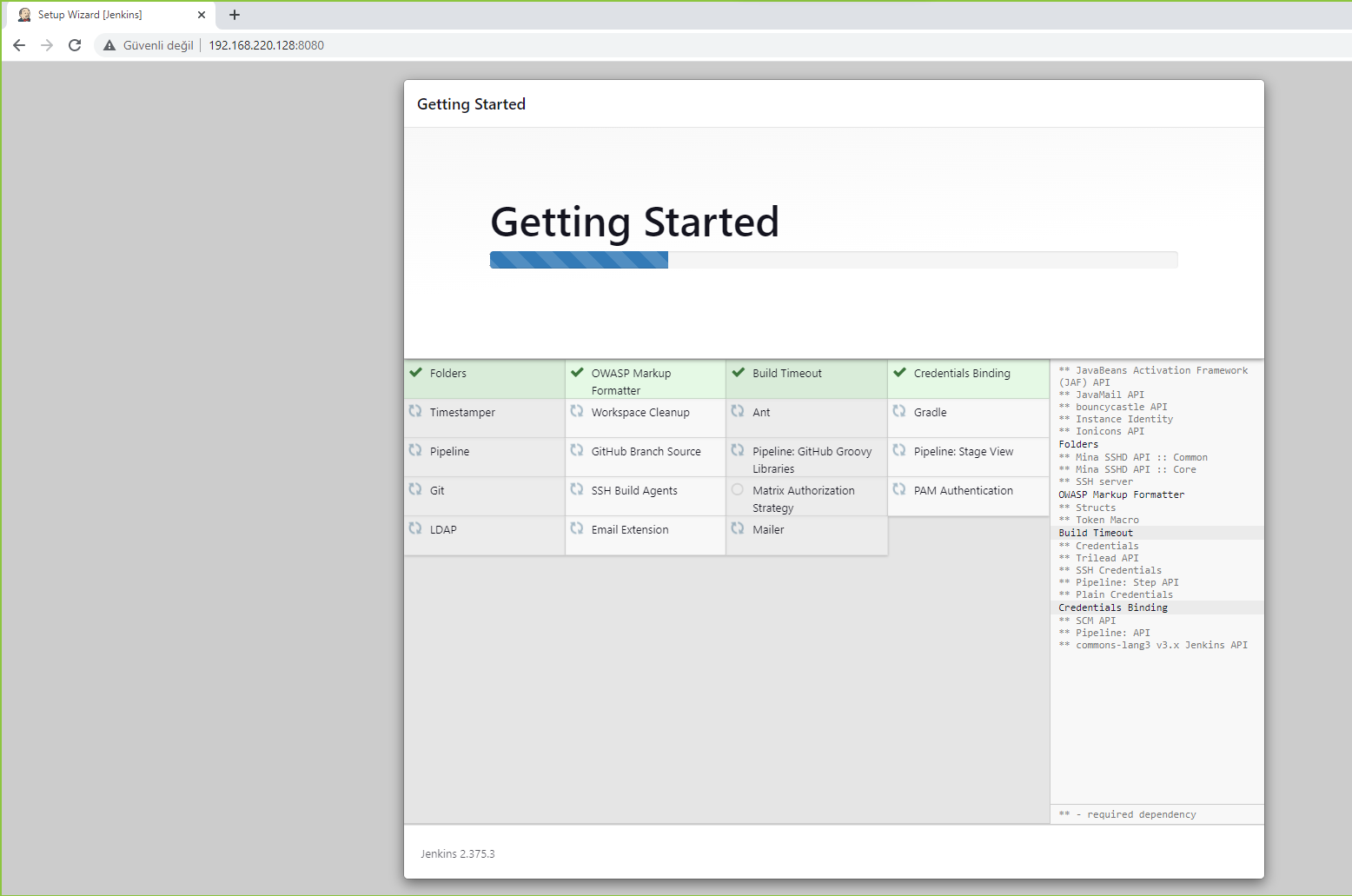 Bu işlemleri tamamladıktan sonra artık Jenkins arayüzüne ulaşabilirsiniz. Bunun için aşağıdaki adresi tarayıcınızda açmanız gerekmektedir.