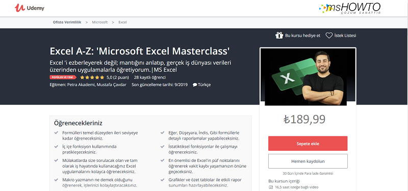 Sevgili Mustafa Çavdar‘ın Udemy’de hazırlamış olduğu Excel A-Z: ‘Microsoft Excel Masterclass’ eğitimini toplamda 500 MSHOWTO takipçisine hediye ediyoruz. 189 TL olan bu eğitimi sizler ücretsiz olarak alabileceksiniz.