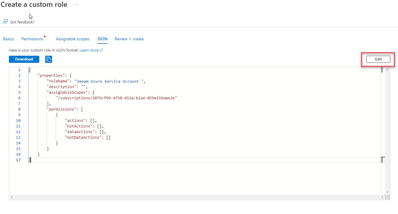 Oluşturacağımız custom role ben Veeam Azure Service Account diyorum ve baseline permissions kısmında Start from JSON’ı seçiyorum ve ilerliyorum.
