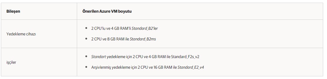 Veeam tarafından önerilen Backup appliance ve Workers’ların Azure VM boyutlarını aşağıdaki tabloda görebilirsiniz.