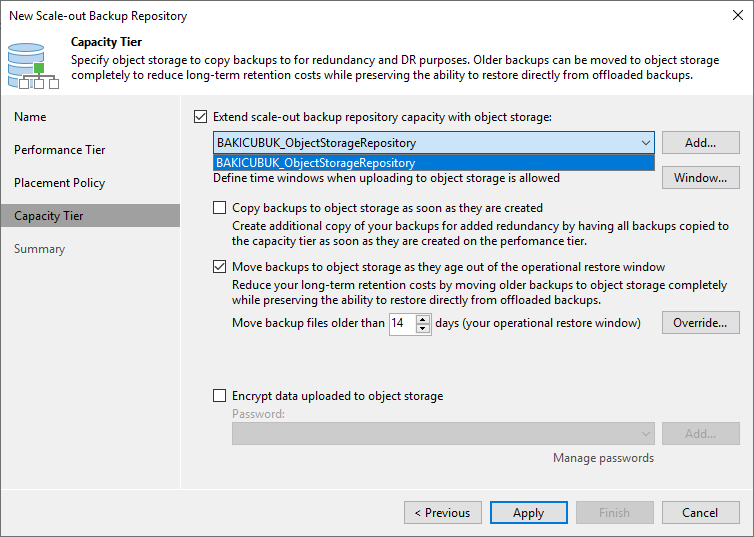 Capacity Tier ekranın da Encrypt data uploaded to object storage Object Storage Repository üzerine yüklenirken şifrelenmesini sağlayabilirsiniz. Password bölümünden mevcut bir Password seçebilir ya da Add diyerek oluşturabilirsiniz.