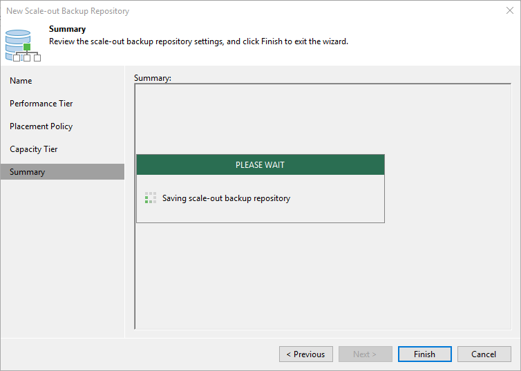 Summary ekranın da Scale-Out Backup Repository yapılandırmasının tamamlandığını görüyoruz. Finish diyerek yapılandırmayı sonlandırıyoruz.