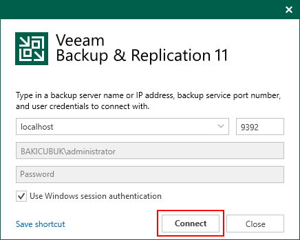 Veeam Backup & Replication 11 konsolunu Connect diyerek açıyoruz.