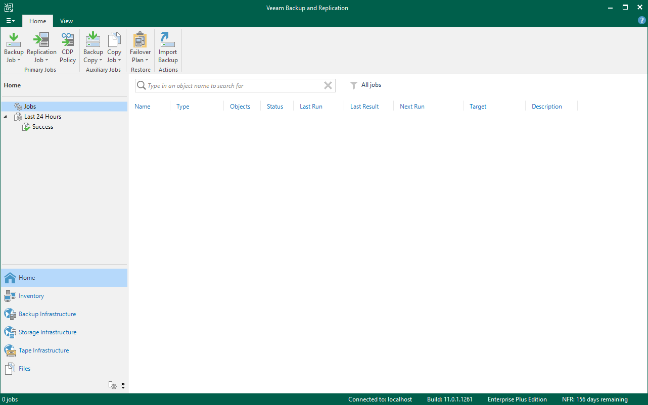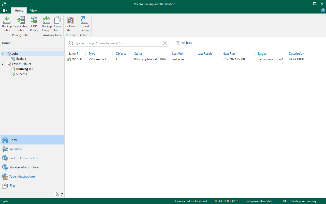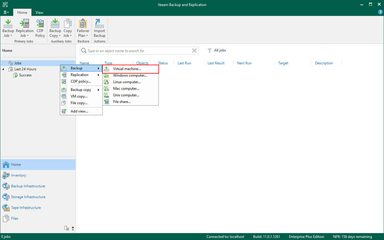 Veeam Backup & Replication 11 konsulu geliyor karışmıza Veeam Backup & Replication 11 konsolun da bulunan Home bölümü altında bulunan Jobs sekmesinden yapılandırıyoruz.