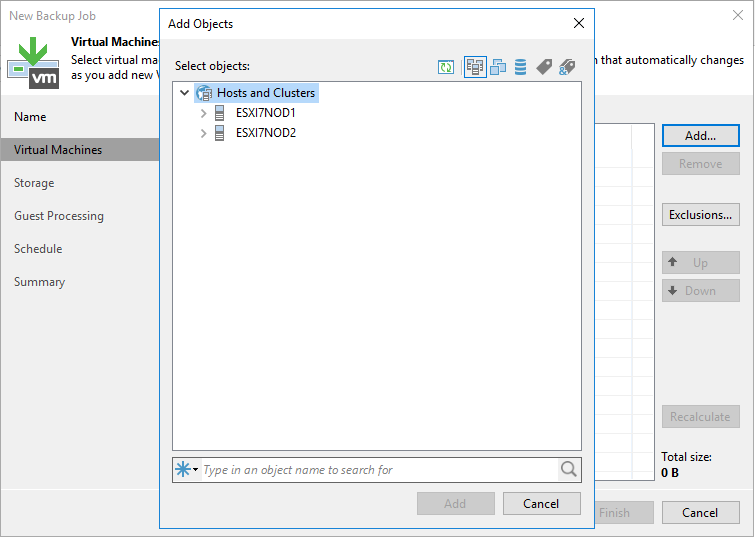 Add Objects ekranı geliyor karşımıza Hosts and Clusters altında yapımıza göre VMware ESXi ( Standalone ) sunucumuz üzerinde ya da VMware ESXi Cluster yapımızdaki hostlarımız üzerinde bulunan Virtual Machine ( Sanal Makine ) görüntülenecektir.