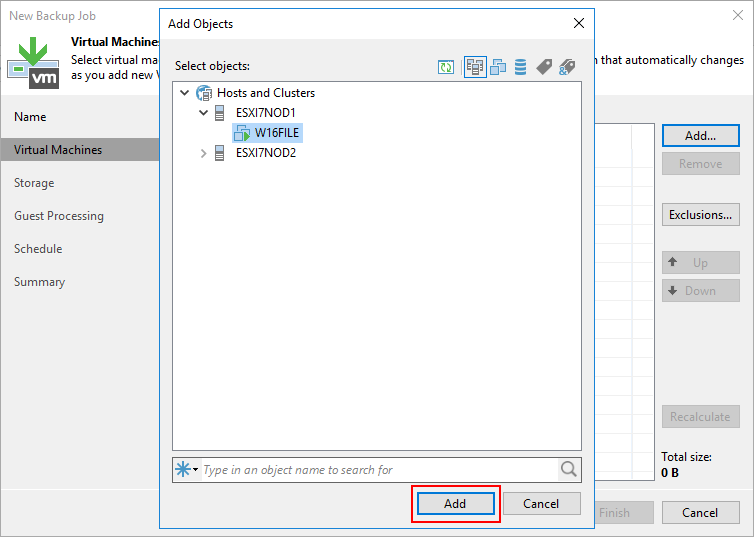 Add Objects ekranın da Hosts and Clusters altında VMware ESXi ( Standalone ) yapımız üzerinde bulunan W16FILE isimli Virtual Machine (Sanal Makine ) seçiyoruz ve Add diyoruz.