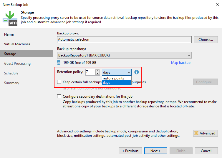 Storage ekranın da Veeam Backup & Replication 10 ile birlikte Retention policy seçeneği olarak geldiğini görüyoruz ve restore points ( Geri Yükleme Noktası ) ya da days ( Günler ) olarak seçebiliyoruz artık.