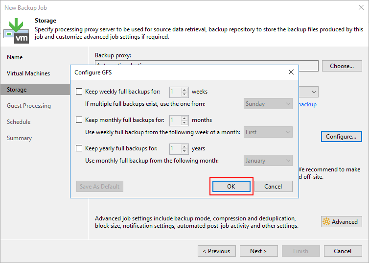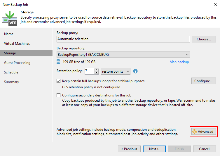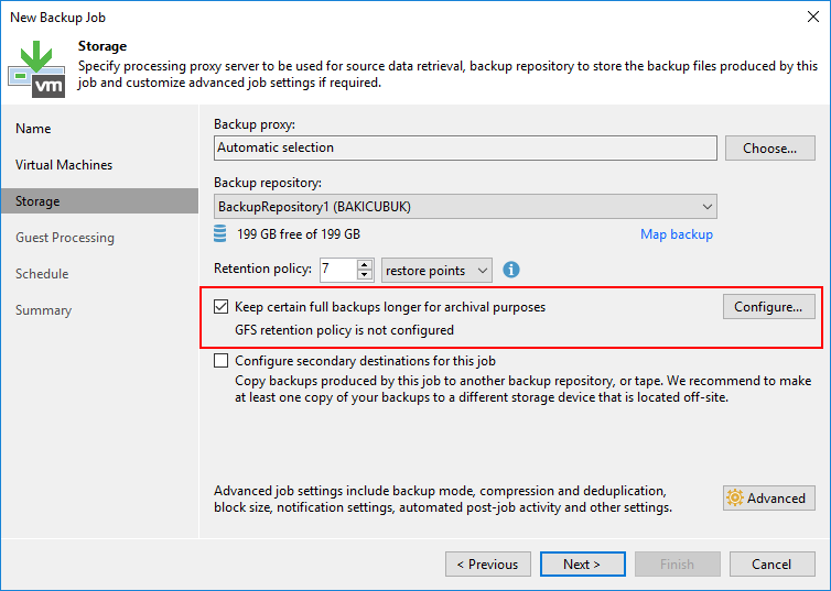 Storage ekranın da Veeam Backup & Replication 10 ile birlikte Keep certain full backups longer for archival purposes seçeneği gelmişti. Keep certain full backups longer for archival purposes seçeneği ile alınan Full Backups ( Tam Yedek ) Weeks ( Haftalık ), Mounths ( Aylık ) ve Years ( Yıllık ) olarak Restore Point ( Geri Yükleme Noktası ) daha uzun tutabilirsiniz.