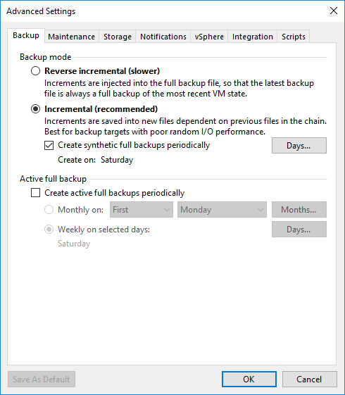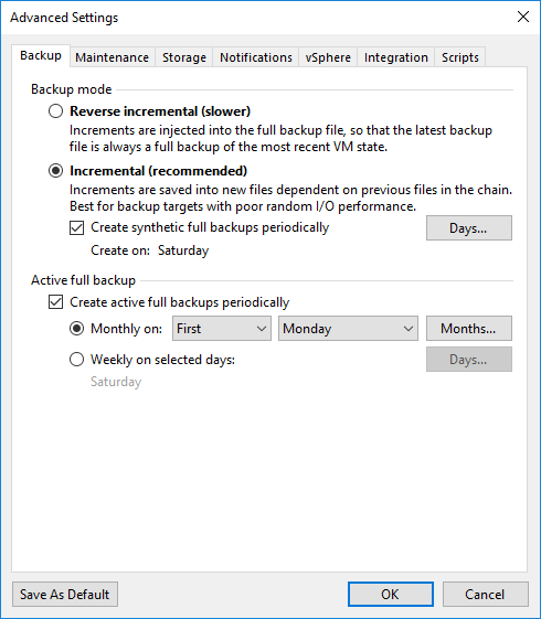 Advanced Settings ekranın da Backup sekmesin de Backup mode bölümü altında Reversed incremental (slower) ve Incremental backup (recommended) seçenekleri bulunmaktadır.
