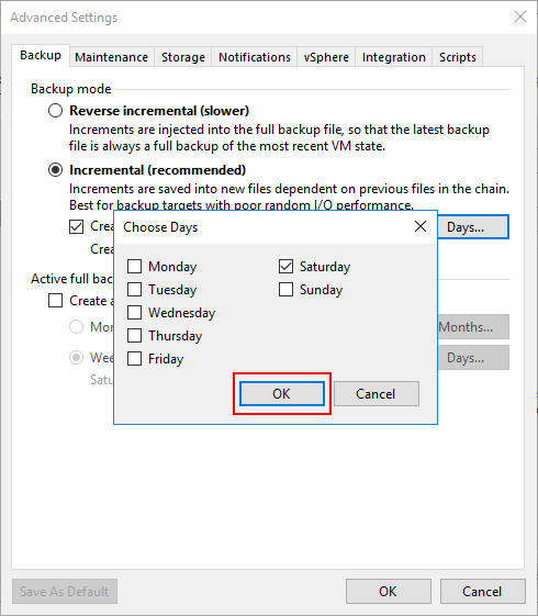 Advanced Settings ekranın da Backup sekmesin de Backup mode altında bulunan Incremental backup (recommended) seçeneği altında bulunan Create synthetic full backup periodically seçeneği seçeli iken Days seçeneği ile Full Backup ( Tam Yedek ) alınacak günleri yapılandırabilirsiniz.