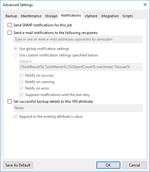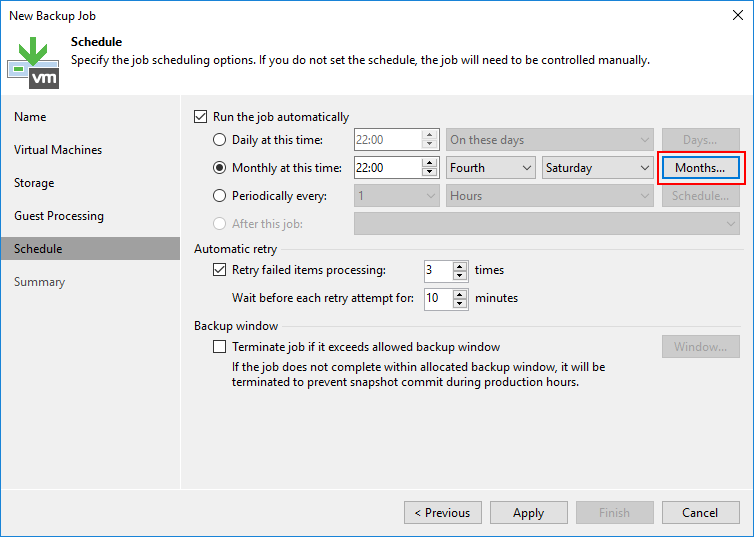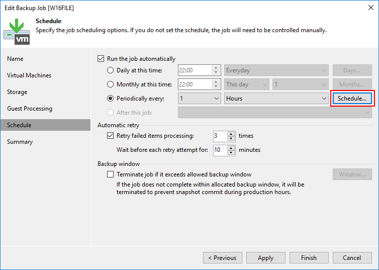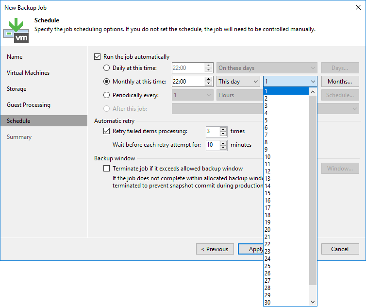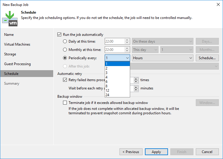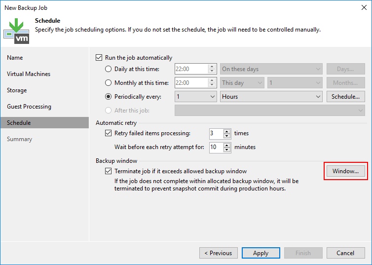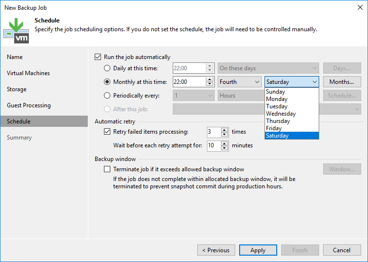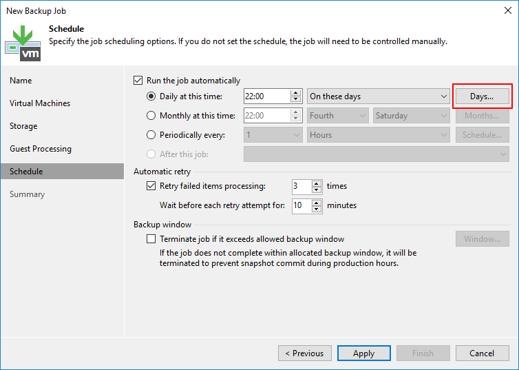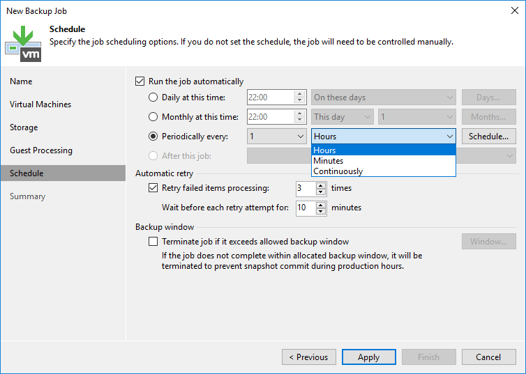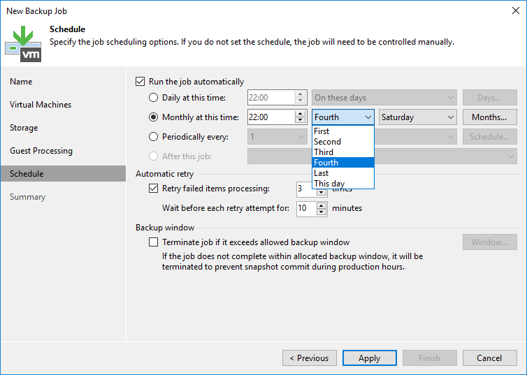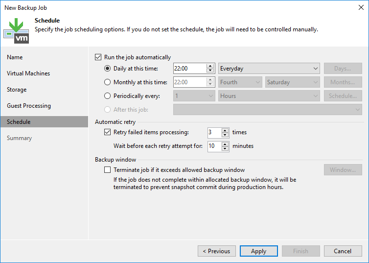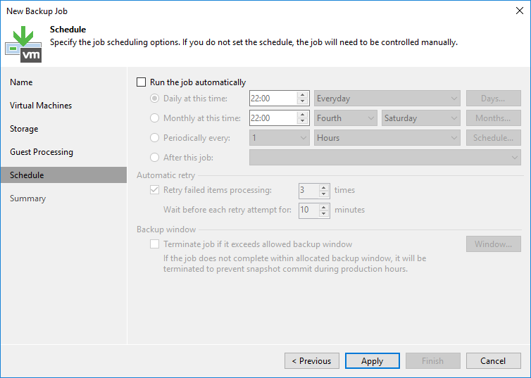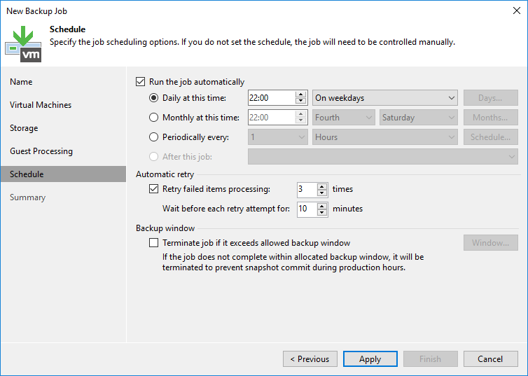 - Retry failed items processing : Herhangi bir sorundan dolayı Backup Job hata verirse Backup Job kaç defa tekrar yeniden çalışacağını yapılandırabilirsiniz.